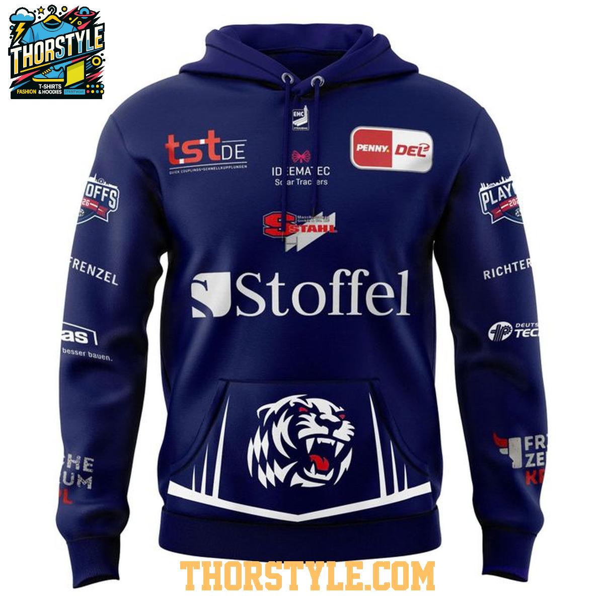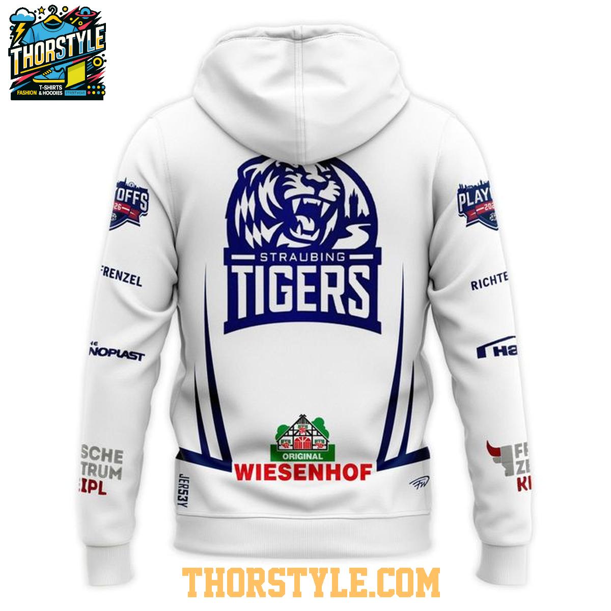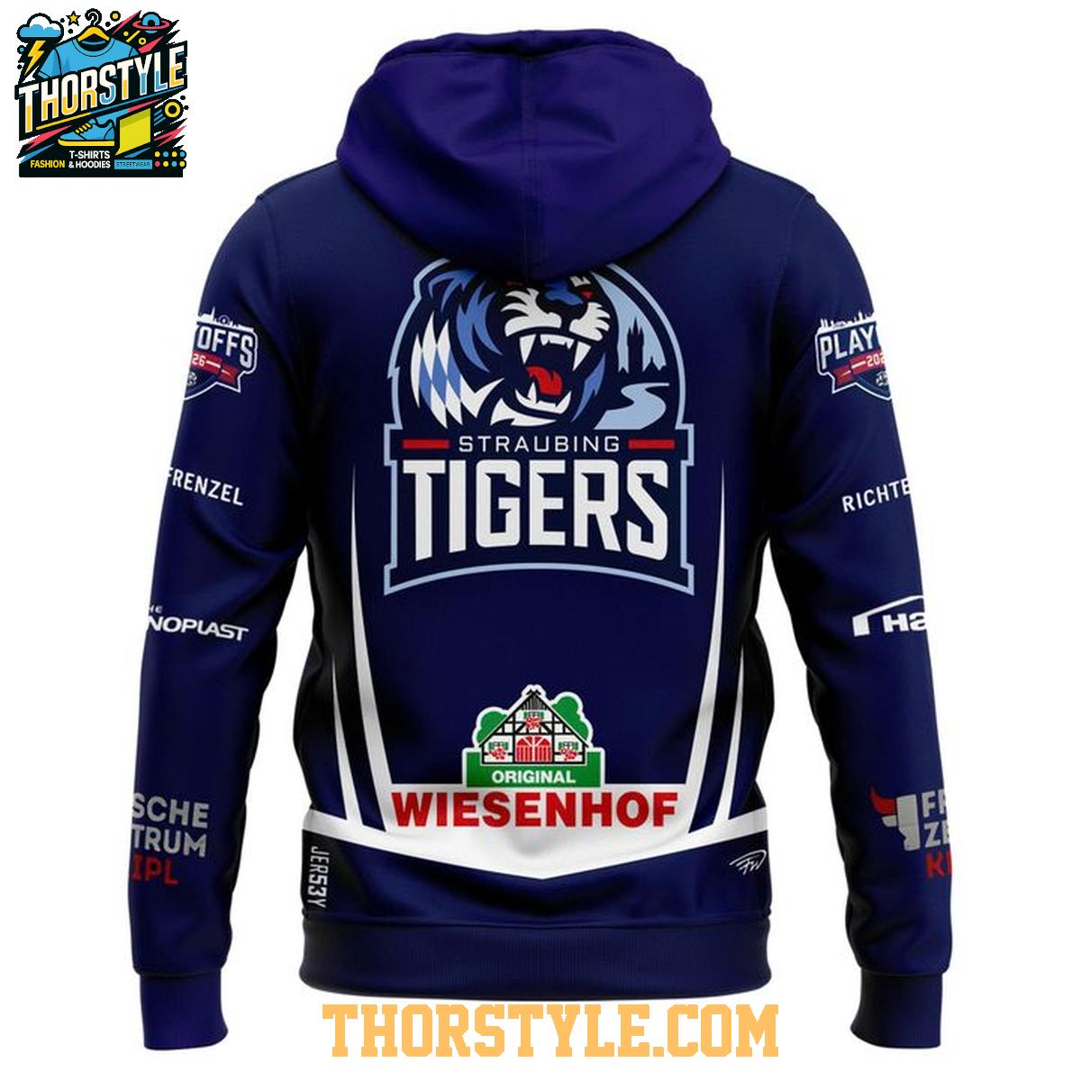 The design meticulously replicates the team's official playoff uniform, proudly displaying the iconic Straubing Tigers logo in a prominent position. Furthermore, it incorporates the various sponsor logos that are an integral part of the official jersey design, ensuring an authentic and recognizable look. This meticulous attention to detail transforms the hoodie t-shirt into a standout piece for any devoted fan eager to represent their team with pride and passion.