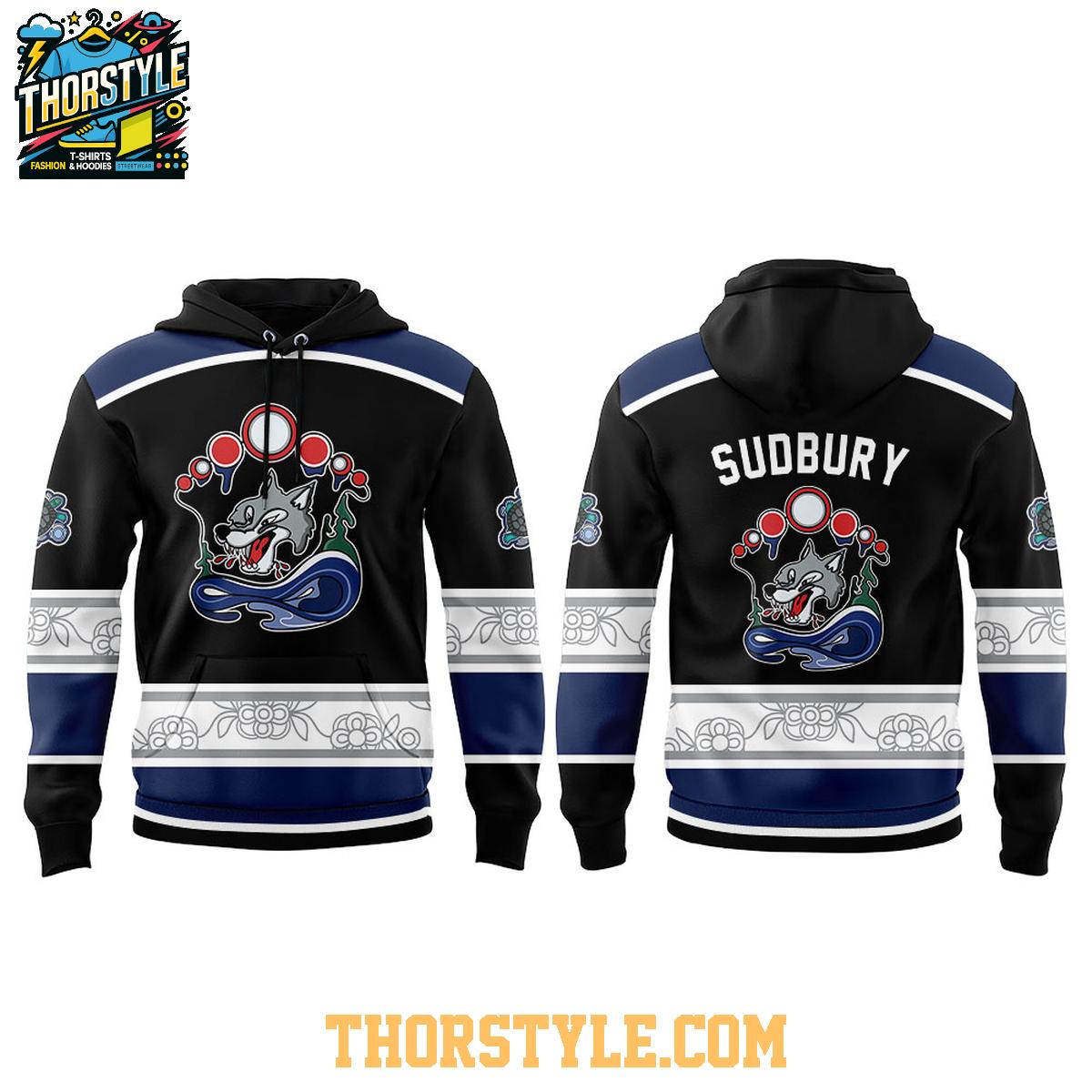 Imagine yourself sporting this Sudbury Wolves hoodie t-shirt at the rink, cheering on your favorite team. Or picture wearing it casually with jeans or shorts for a comfortable and stylish weekend look. The distinctive design is sure to spark conversations and show your appreciation for both hockey and Indigenous heritage. This hoodie t-shirt offers a unique way to represent the Sudbury Wolves and their dedication to community partnerships.