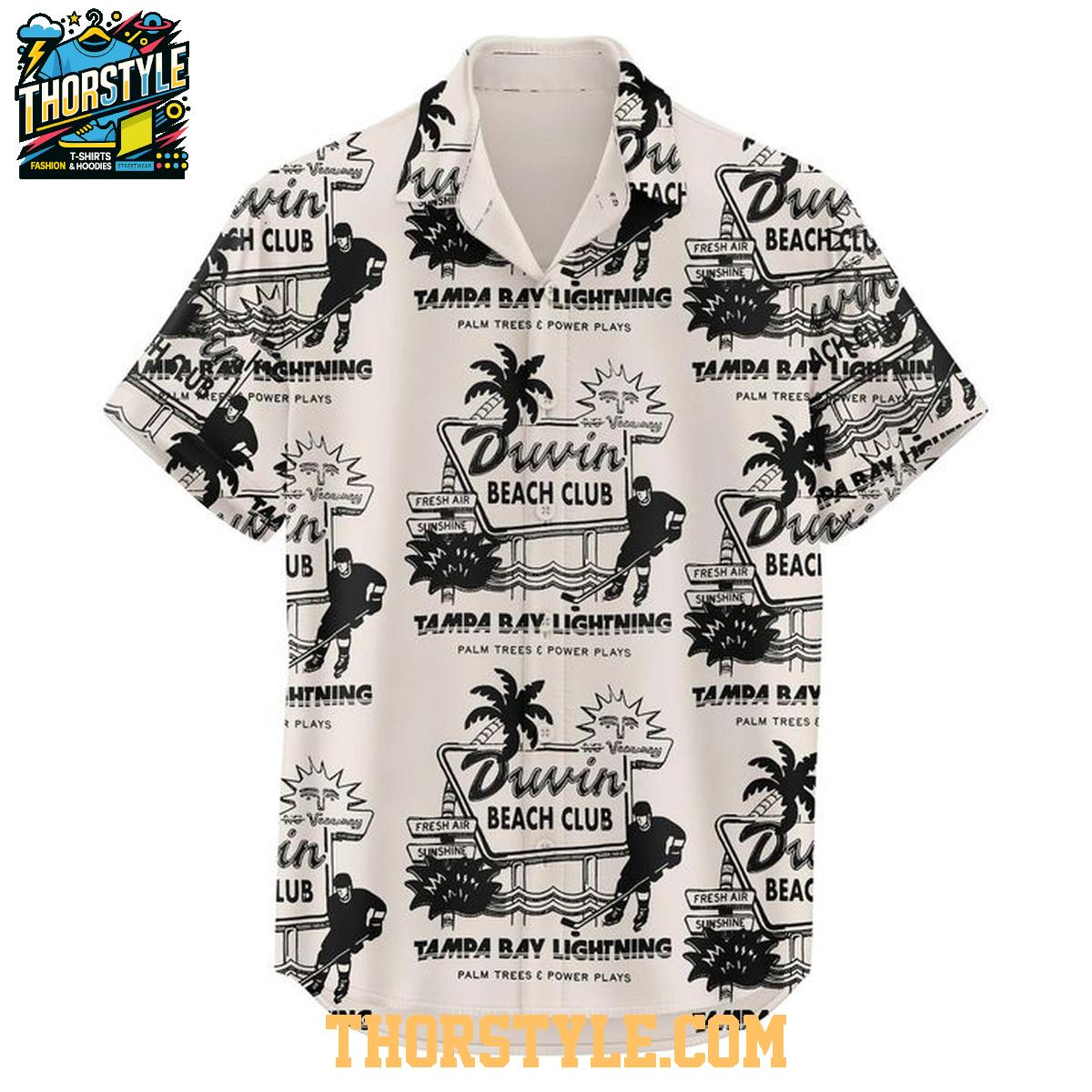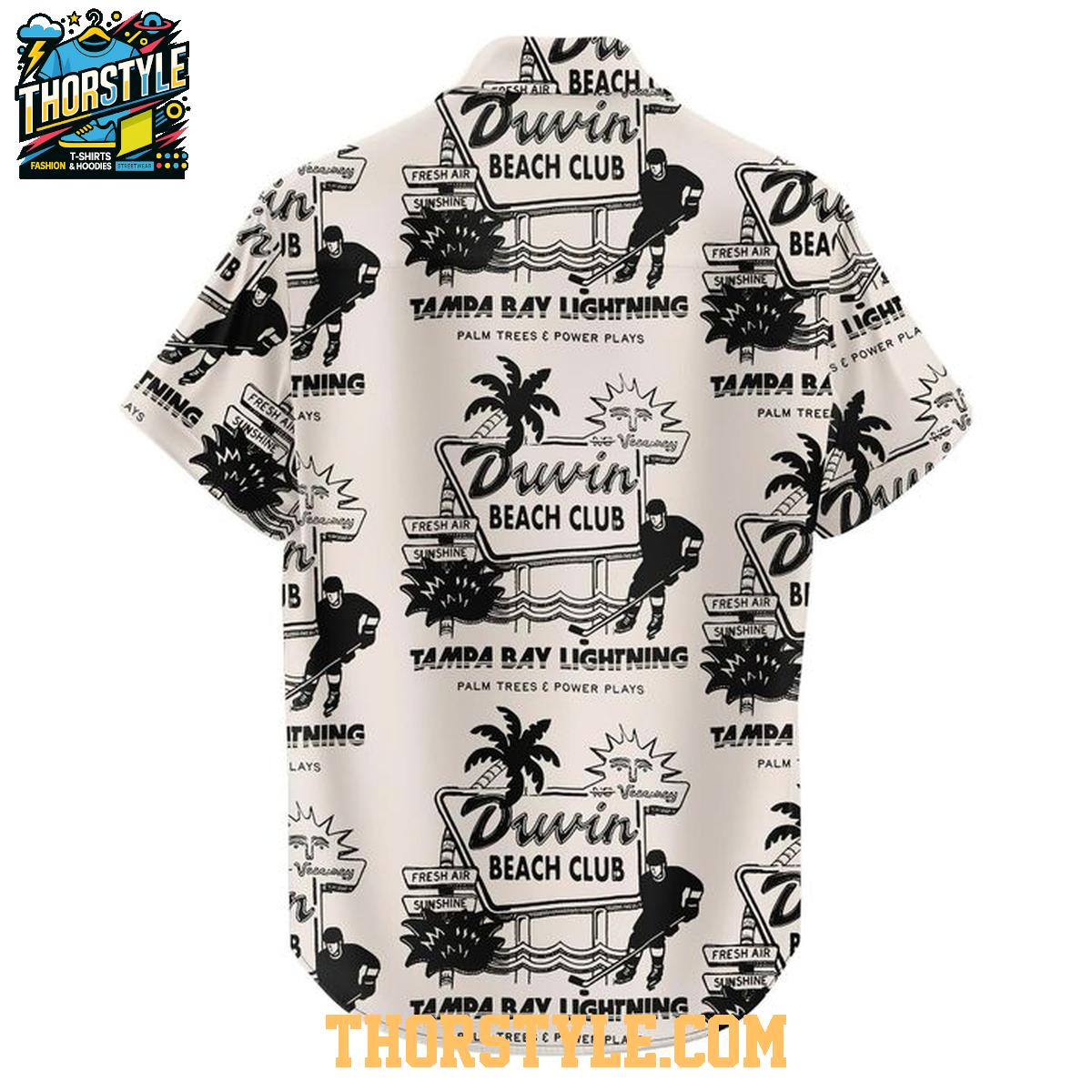 The shirt showcases an eye-catching repeating pattern that cleverly integrates the iconic Lightning logo with tropical palm trees and a distinctive "Beach Club" motif. This playful combination creates a fun and memorable design that perfectly captures the spirit of relaxation and celebration. Whether you're heading to a game, lounging on the beach, or simply enjoying a casual get-together with friends, this shirt is guaranteed to turn heads and spark conversation. The design is a vibrant tribute to both the team and the Sunshine State.