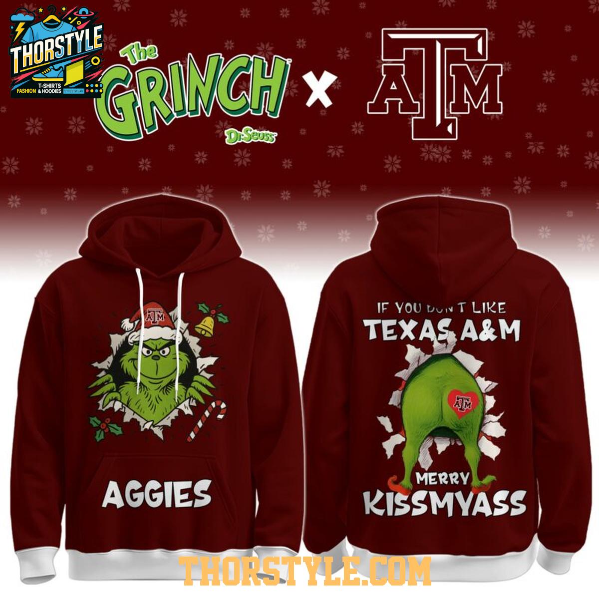 Show off your Aggie spirit with a touch of Grinchy mischief this holiday season with the Texas A&M Aggies Grinch Naughty Kissmyass Christmas 2025 Hoodie T-Shirt. This unique apparel combines the beloved Dr. Seuss character with your favorite college team, creating a fun and festive look perfect for any Aggie fan with a sense of humor.