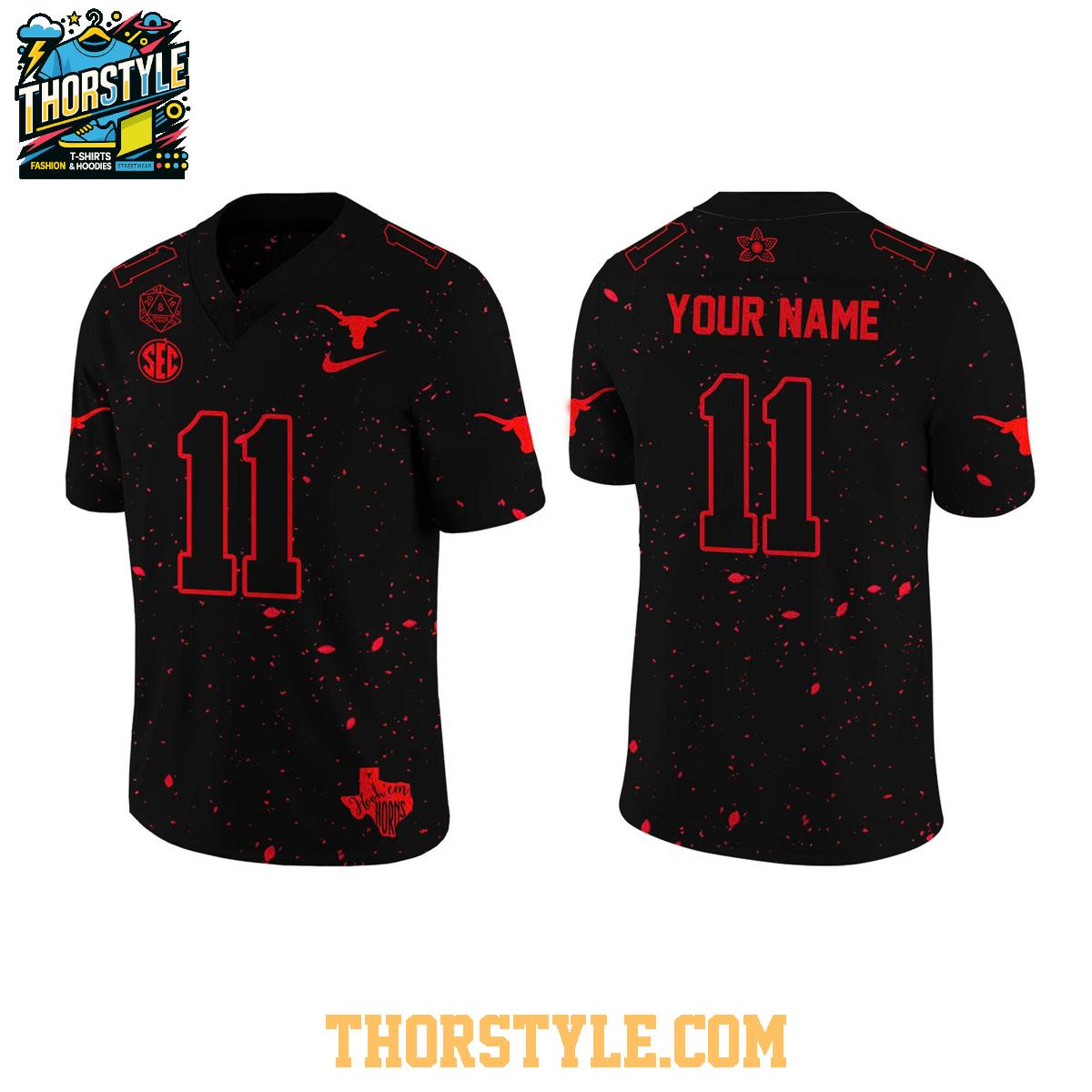 This eye-catching jersey features a design that incorporates elements from both worlds. The Texas Longhorns logo is prominently displayed, alongside details reminiscent of the Upside Down. The jersey proudly displays "SEC" and the number "11" on the front, signifying the team's ambition to conquer the Southeastern Conference. You can even customize it with your own name and number, making it a truly personal piece of fan apparel.