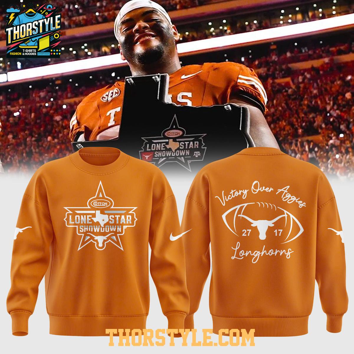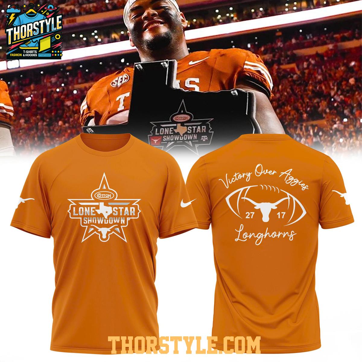 The design features bold and eye-catching graphics that celebrate the Longhorns' triumphant victory over their rivals. The front of the garment proudly displays the iconic "Lone Star Showdown" emblem, symbolizing the intensity of this legendary rivalry. The back showcases the powerful statement "Victory Over Aggies," accompanied by the instantly recognizable Longhorns logo and the final score from the memorable 2025 game. The vibrant colors and crisp detailing ensure that your team spirit will stand out in any crowd.