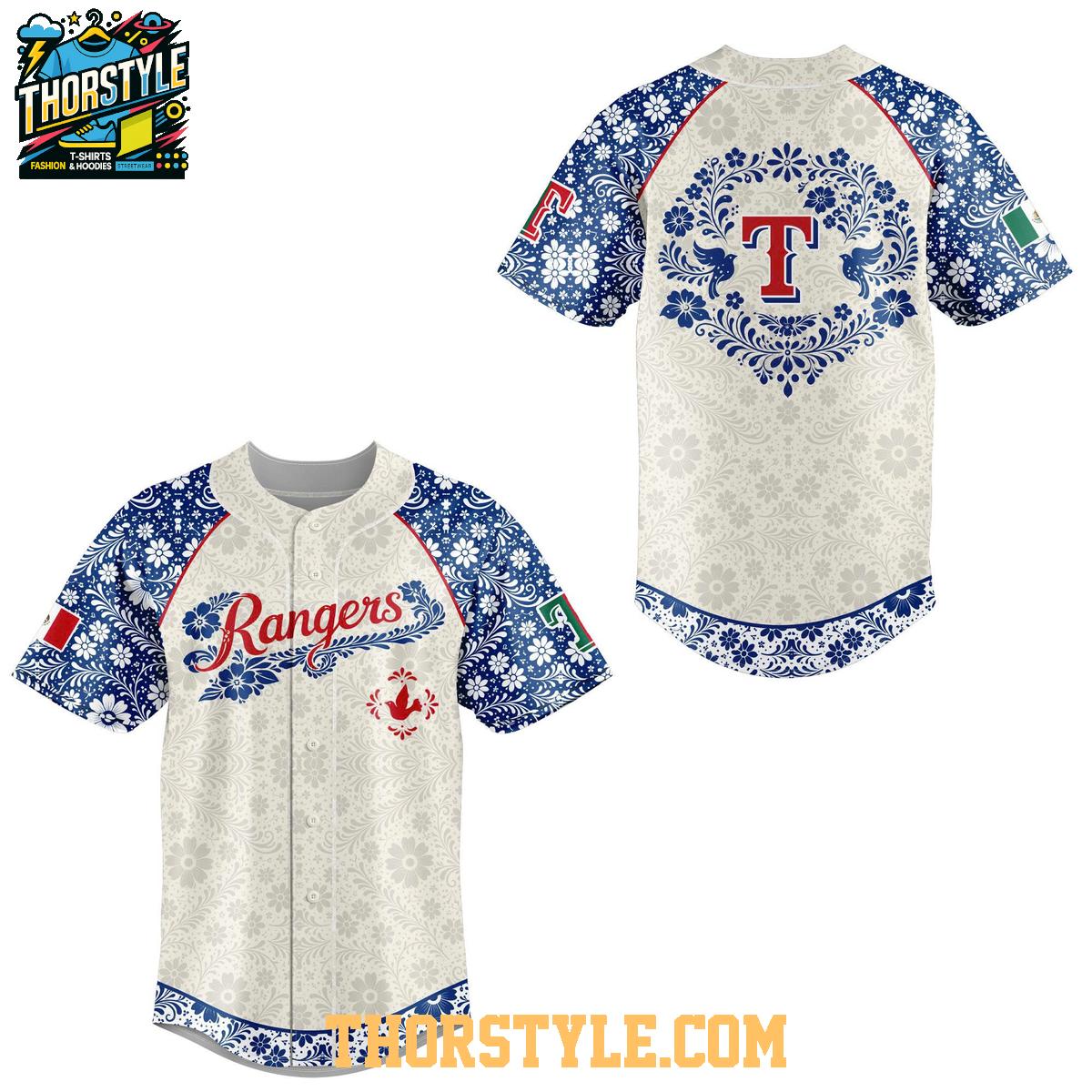 This eye-catching baseball jersey features a striking design incorporating traditional Mexican floral patterns and colors, seamlessly integrated with the Rangers' classic logo and team lettering. The vibrant imagery extends across the sleeves and back, creating a visually stunning garment that’s sure to turn heads. Constructed from breathable, lightweight materials, this jersey offers exceptional comfort whether you're cheering from the stands or enjoying a casual day out.