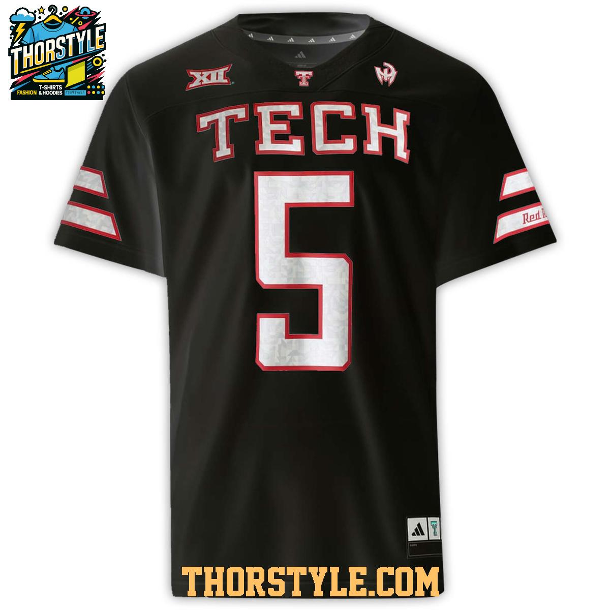 The jersey prominently features "TECH" emblazoned across the chest, accompanied by Mahomes' legendary number "5." Turning to the back, "RED RAIDERS" is proudly displayed above the number "5," complemented by a meticulously crafted replica signature. Available in a sleek black design, this jersey also takes inspiration from the classic Red Raiders white uniform.