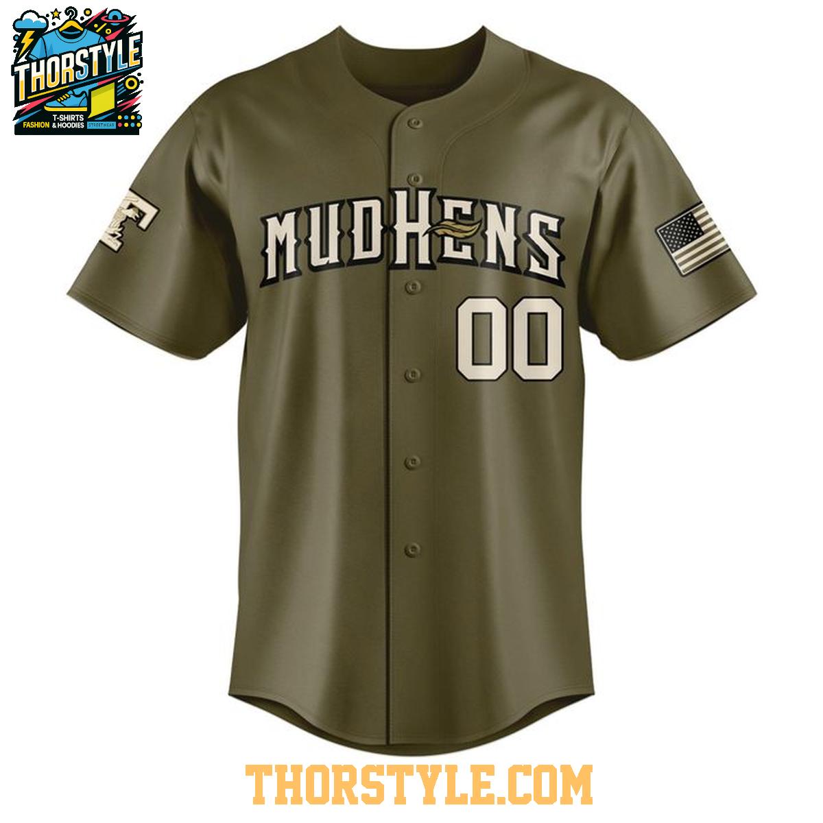 This finely crafted baseball jersey prominently features the "Mud Hens" team name across the chest in a classic athletic font, accompanied by the player number on both the front and back. The olive-drab colorway pays homage to military uniforms, creating a respectful and stylish tribute. A subtle American flag patch adorns one sleeve, while the Mud Hens logo is present on the other, completing the design.