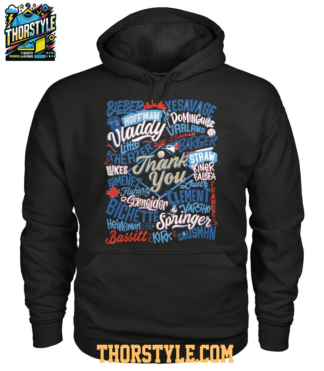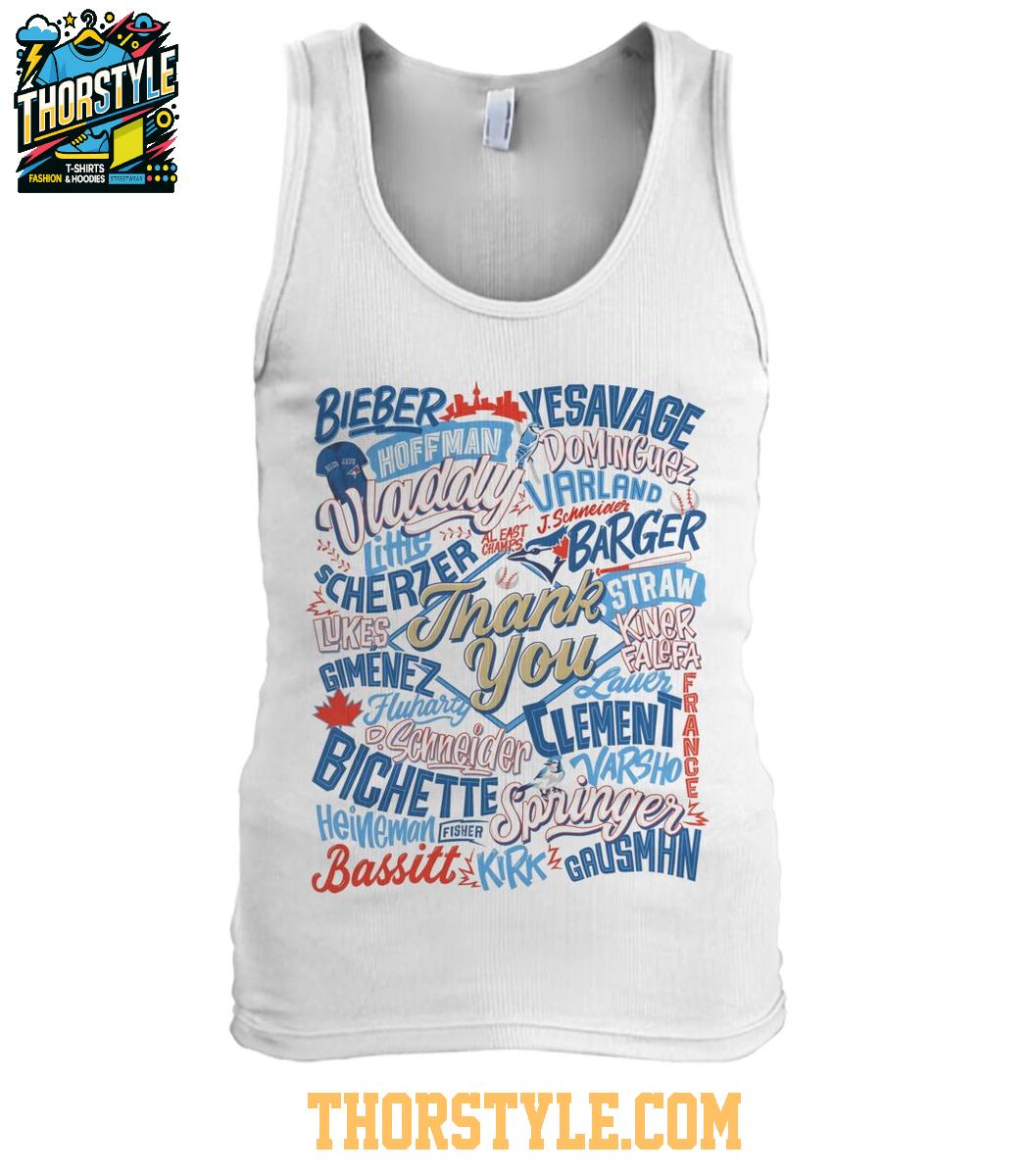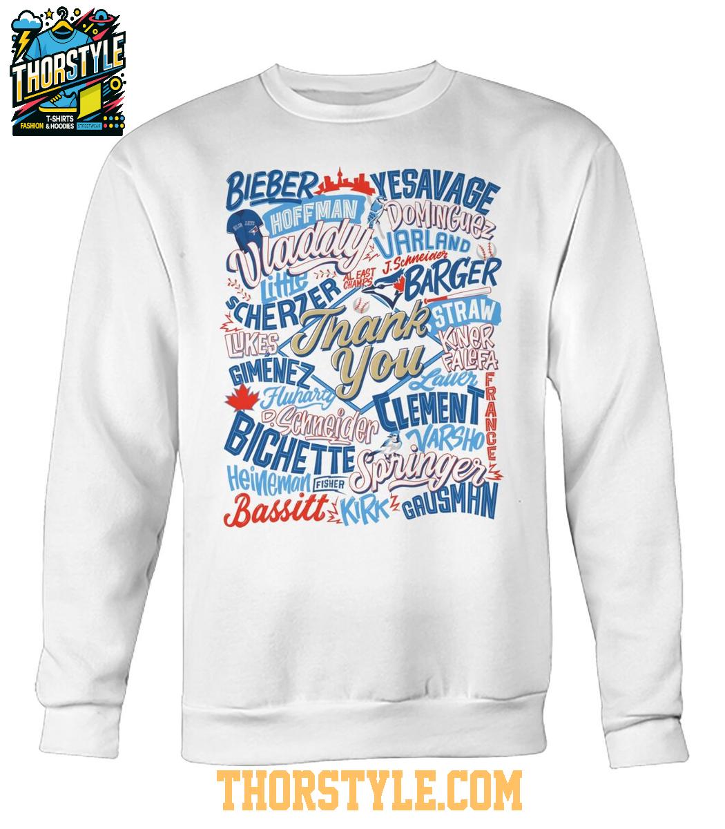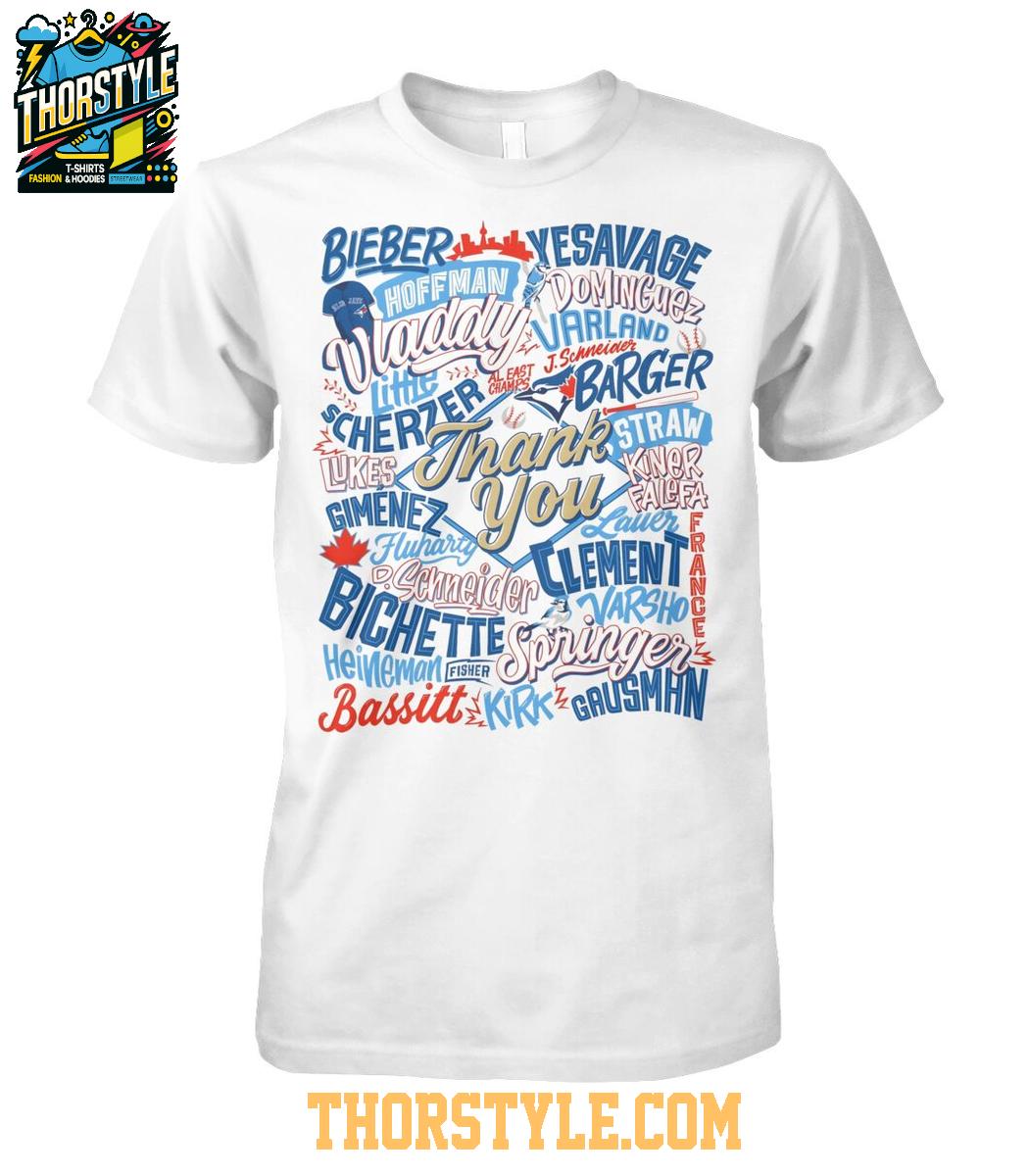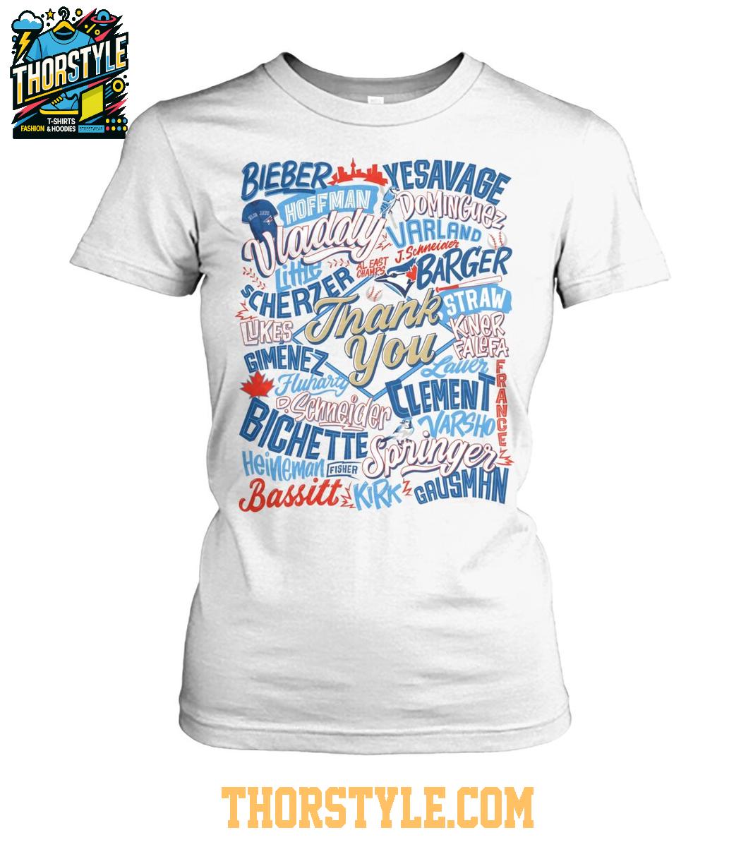 Presented on a crisp, high-quality white fabric, this shirt provides the perfect canvas for a truly dynamic and meaningful graphic. Dominating the design is a bold "Thank You," elegantly integrated with a vibrant, artful collage of iconic player names. This comprehensive roster features established stars such as Bichette, Springer, Gausman, Bassitt, and Kirk, alongside promising emerging talents, collectively symbolizing the team's formidable collective spirit and their proven journey to becoming AL East Champions. A subtly integrated Canadian maple leaf further reinforces national pride and the team's deep roots within the country's sporting landscape.