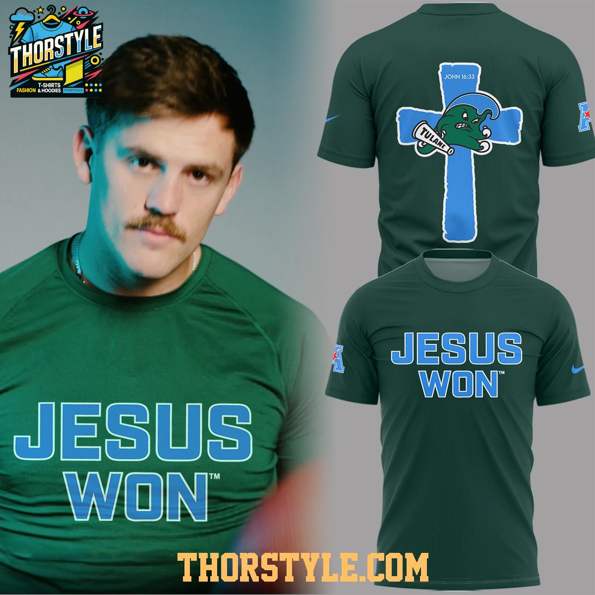 The design features bold graphics that showcase your affiliations. The "Jesus Won" slogan is prominently displayed, reflecting your faith. The Tulane Green Wave imagery represents your school pride. The "2025" detail adds a touch of forward-looking optimism. These elements are carefully printed to ensure they remain vibrant and eye-catching.