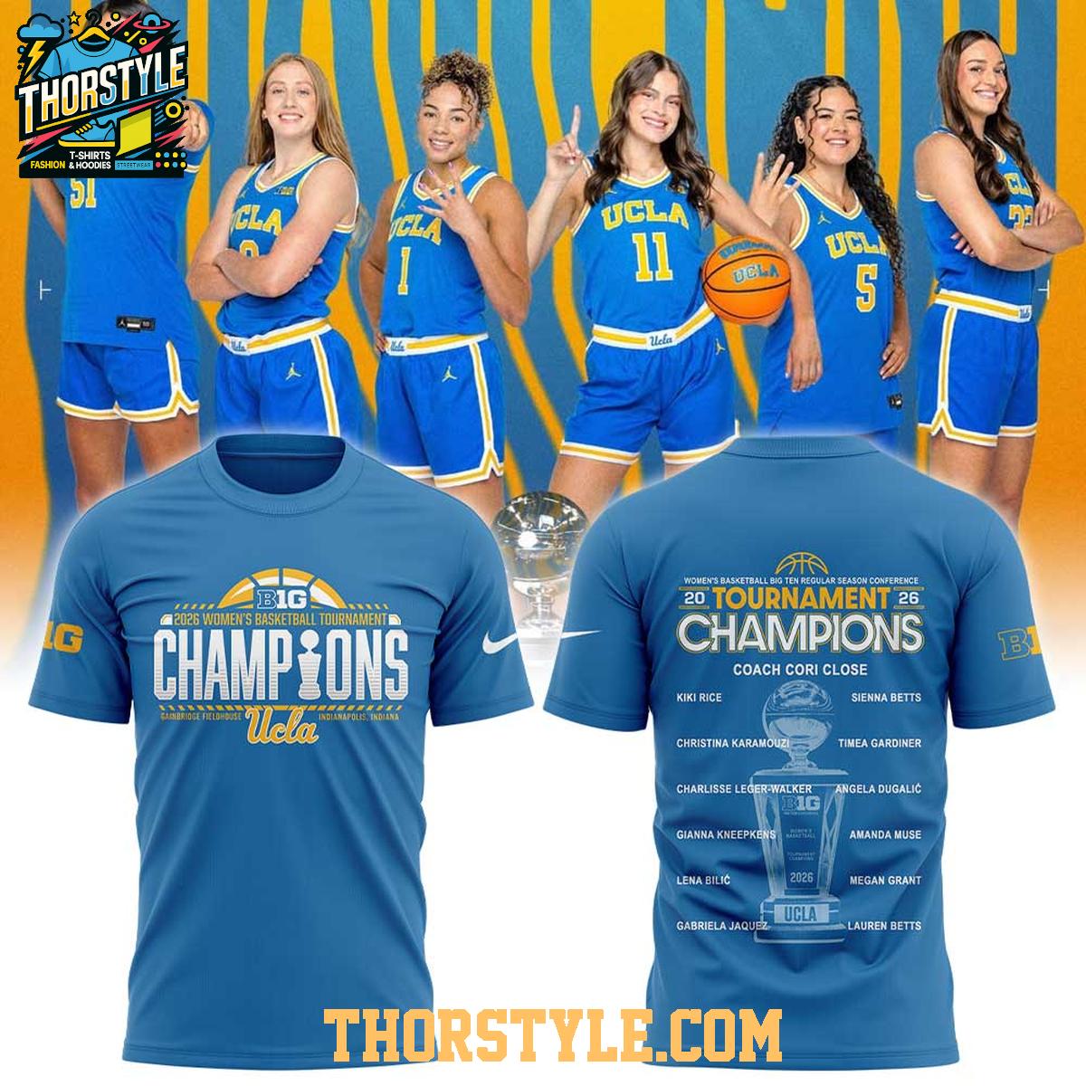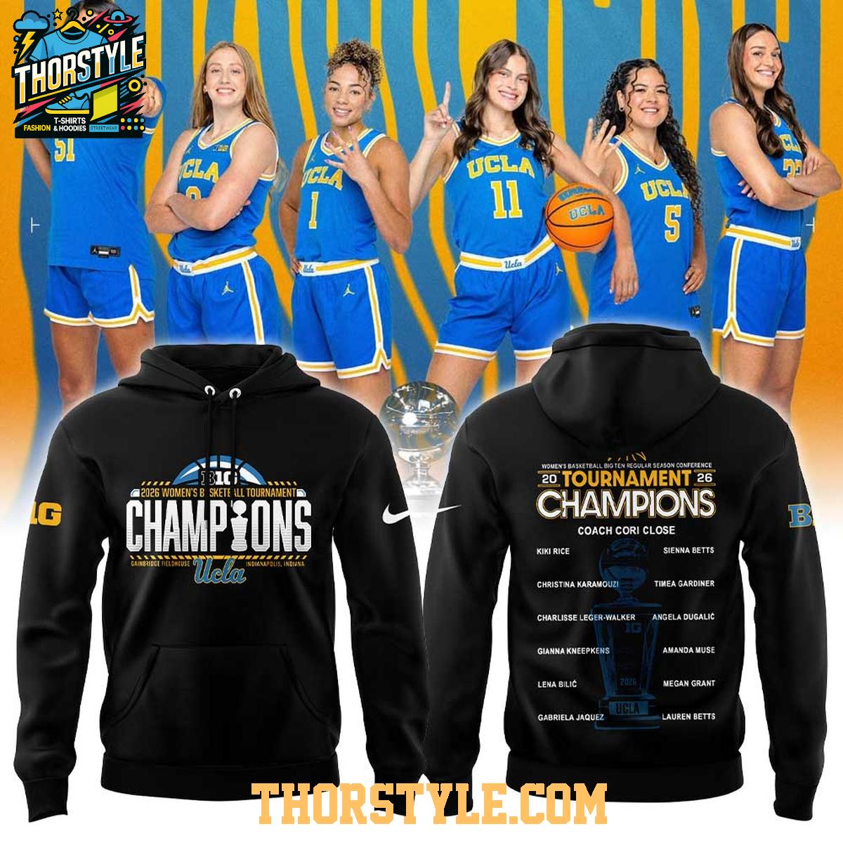 This hoodie t-shirt features bold graphics that proudly display the "Champions" title, along with the UCLA logo and details of the 2026 Big Ten Regular Season Conference victory. The design incorporates the names of the players and coach Cori Close, ensuring that every member of the winning team is recognized. The blend of typography and team imagery creates a striking visual that will undoubtedly turn heads.