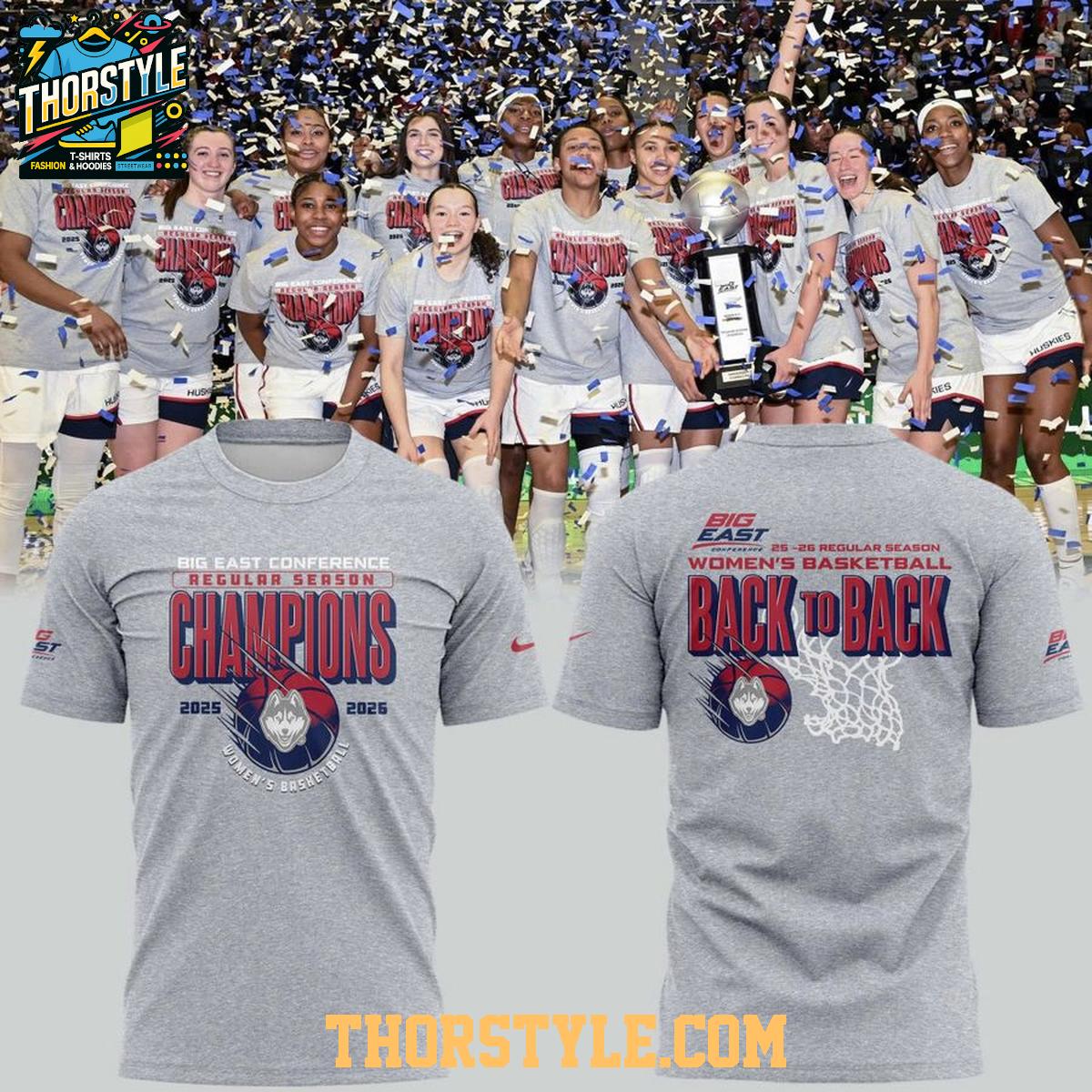 The design boldly showcases the Huskies' back-to-back Big East Regular Season championships from 2025 and 2026. The word "Champions" is prominently displayed on the front alongside the iconic team logo, while the back features "Back to Back" accompanied by a dynamic graphic of a basketball net. The superior printing quality ensures the design remains vibrant and resists fading, even after numerous washes, guaranteeing years of showcasing your Huskies pride.