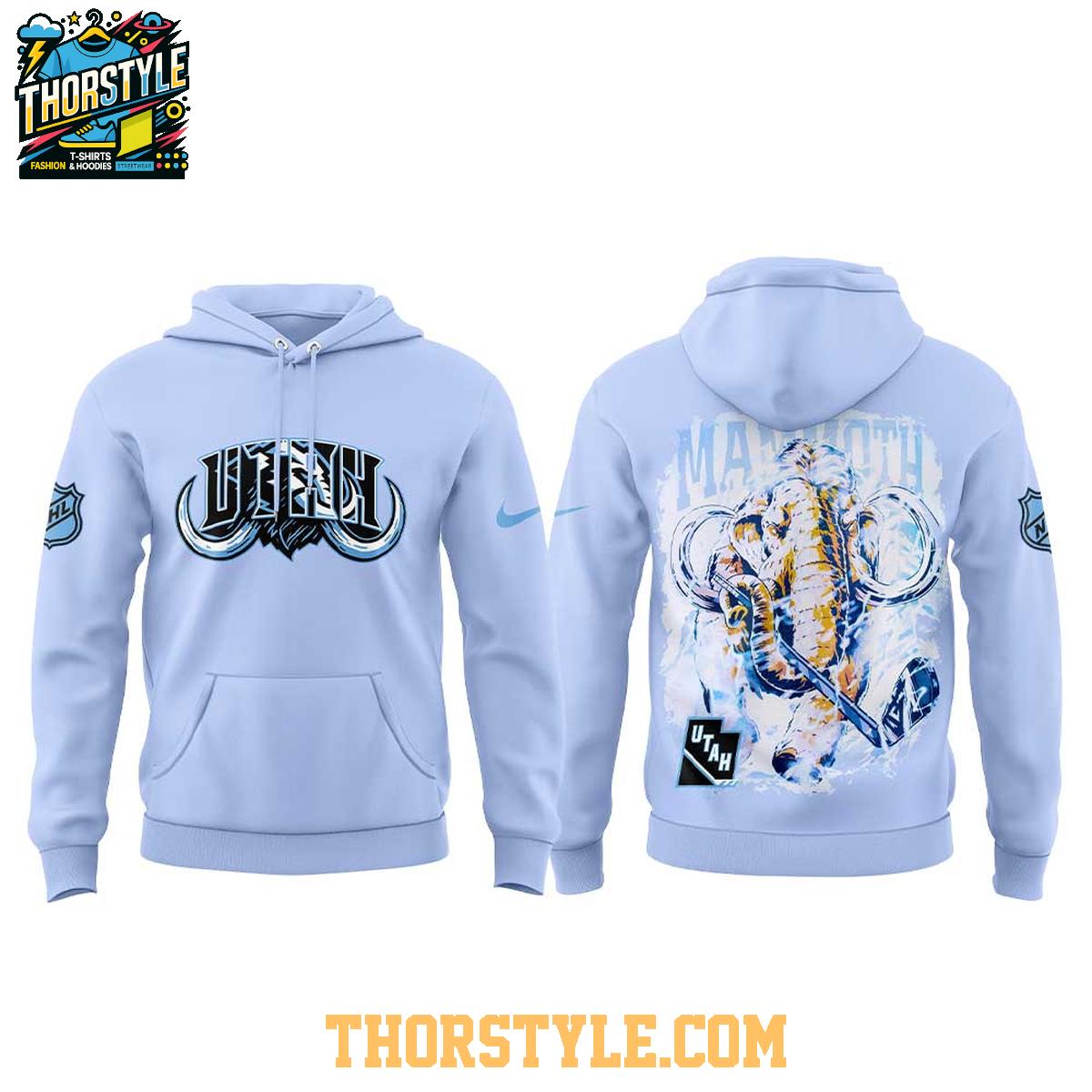 The design features bold graphics that showcase the Utah Mammoth team logo and colors. The front prominently displays "Utah" in a stylized font, while the back features an artistic rendering of a mammoth, paying homage to the team's namesake. The woodngrail pattern adds a unique touch, setting this hoodie t-shirt apart from typical fan gear. The attention to detail in the graphic design ensures that you'll be sporting a high-quality and visually appealing piece of apparel.