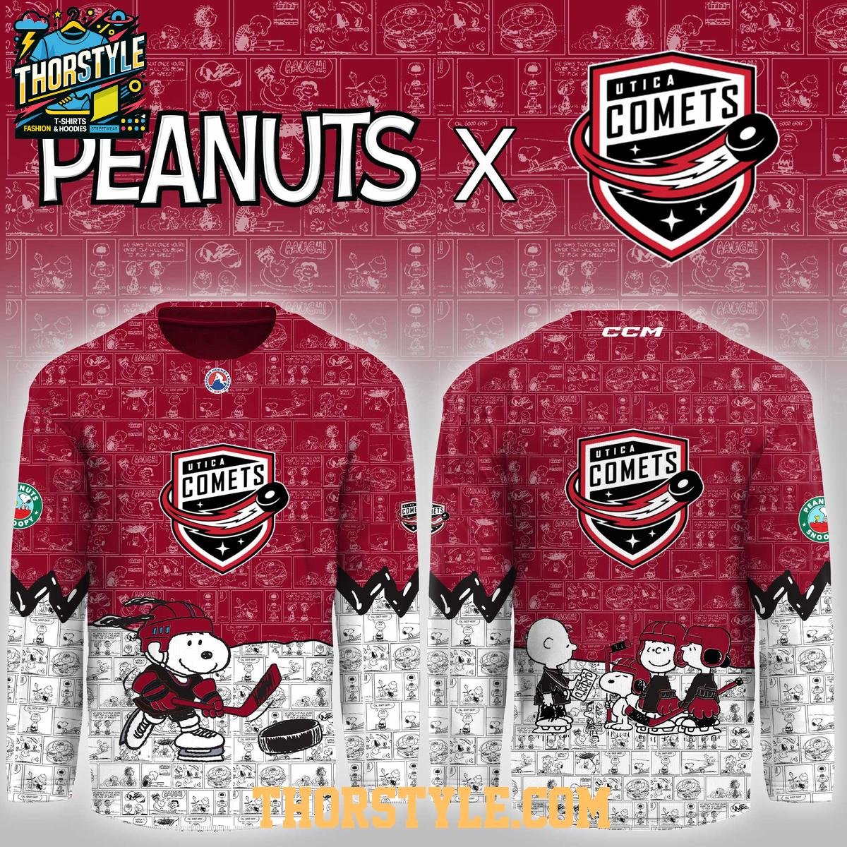 The jersey boasts a vibrant and eye-catching design, thoughtfully integrating the iconic Utica Comets logo with beloved Peanuts characters like Charlie Brown, Snoopy, and the rest of the gang. These playful graphics are strategically incorporated throughout the jersey, creating a visually striking garment that is sure to turn heads whether you're at the game, out with friends, or simply running errands.