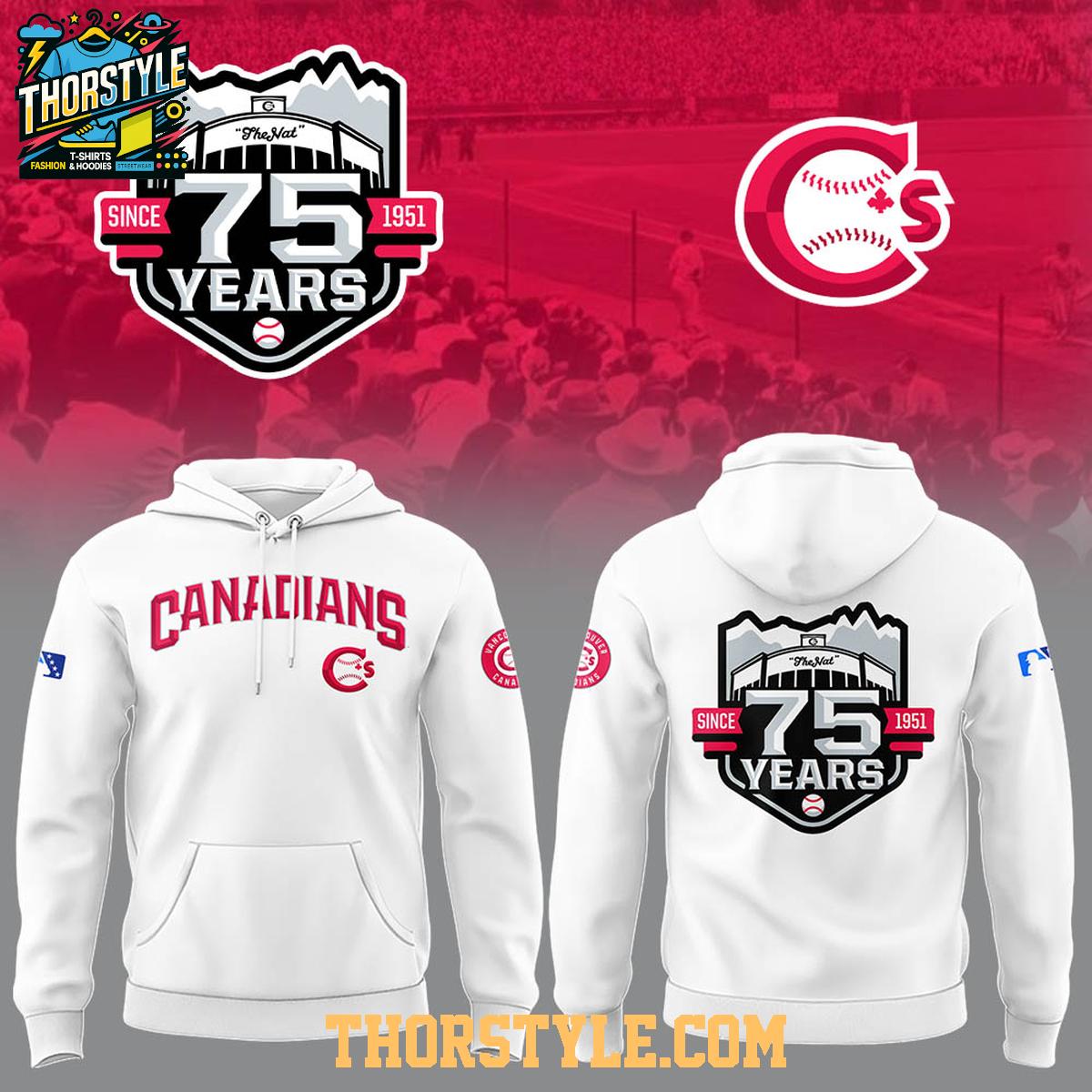 The design features bold graphics commemorating the 75th anniversary of Nat Bailey Stadium, showcasing the iconic "The Nat" stadium imagery. The front prominently displays "Canadians" along with the team's logo. The back showcases the 75th-anniversary logo, a constant reminder of the rich history and tradition of Vancouver baseball. The vibrant colors and detailed artwork make this hoodie t-shirt a standout piece in any fan's wardrobe.