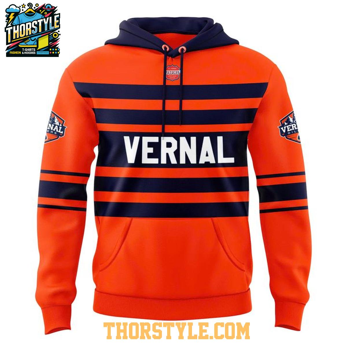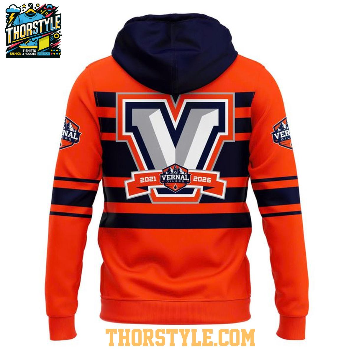 This hoodie t-shirt features a vibrant orange base, accented with bold navy blue stripes across the chest and sleeves. The word "VERNAL" is prominently displayed across the front, while the back showcases a large "V" logo with "2021 Vernal 2026 Oilers" emblazoned underneath, capturing the essence of the throwback night. Sleeve patches with the Vernal Oilers logo add a touch of authenticity.