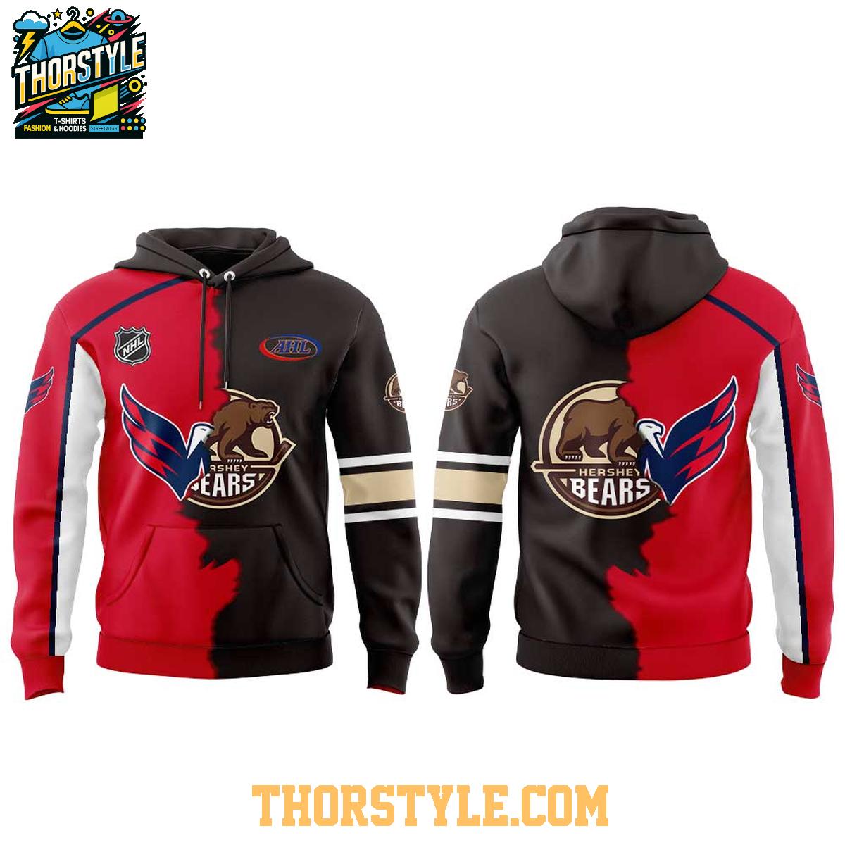 More than just a piece of apparel, this hoodie t-shirt is a true statement of hockey fandom. Effortlessly pair it with jeans and sneakers for a relaxed, casual look, or elevate your style by dressing it up with chinos for a more refined appearance. The durable construction ensures that it will withstand the rigors of regular wear, maintaining its shape and color for seasons to come. This Washington Capitals x Hershey Bears hoodie t-shirt is the perfect way to show your team spirit and celebrate the partnership between these two exceptional hockey organizations.