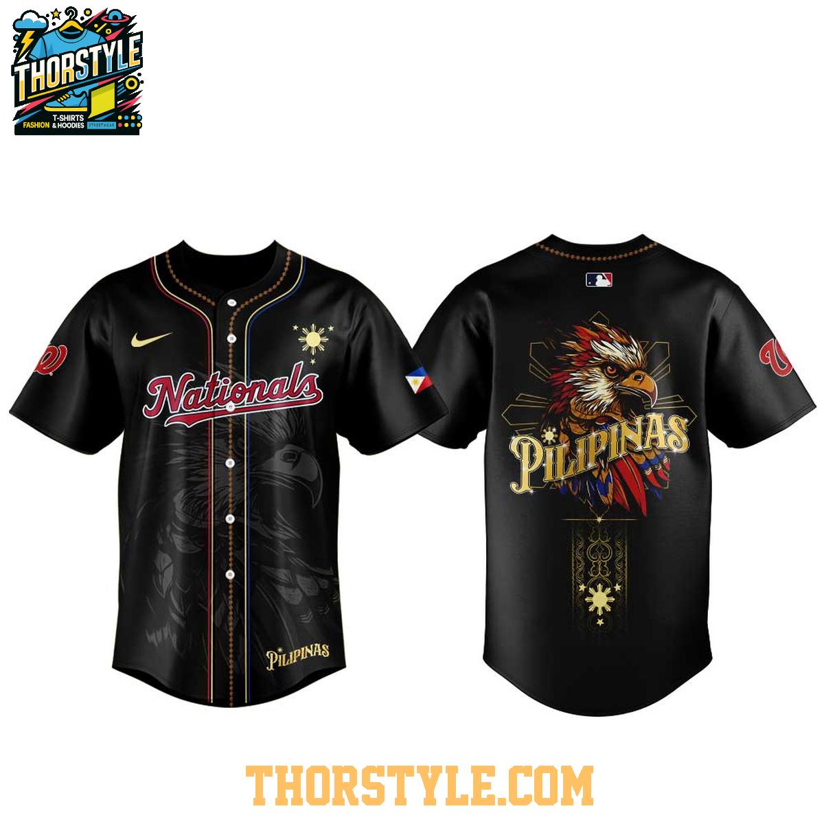 The design seamlessly blends iconic Filipino symbols with the Nationals' team branding, creating a visually striking and meaningful garment. The front of the jersey proudly displays the "Nationals" script, while the back showcases "Pilipinas" alongside a majestic eagle design, representing the Philippines with grace and power. Subtle yet significant details, such as the sun and stars emblem, add an extra touch of cultural resonance and significance, completing the design with thoughtful precision.