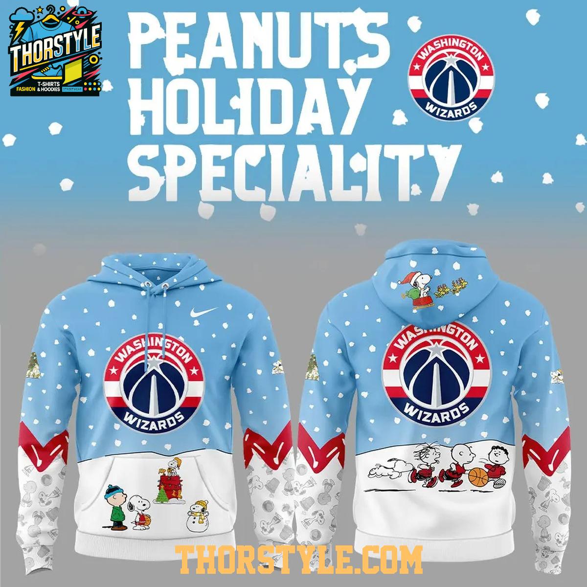 The design features vibrant graphics that capture the essence of both the Washington Wizards and the Peanuts characters. The team's logo is prominently displayed, intertwined with beloved Peanuts figures like Snoopy, Charlie Brown, and the rest of the gang engaging in playful antics, creating a fun and festive appearance. The all-over print includes details like snowflakes and basketballs, adding to the unique appeal.