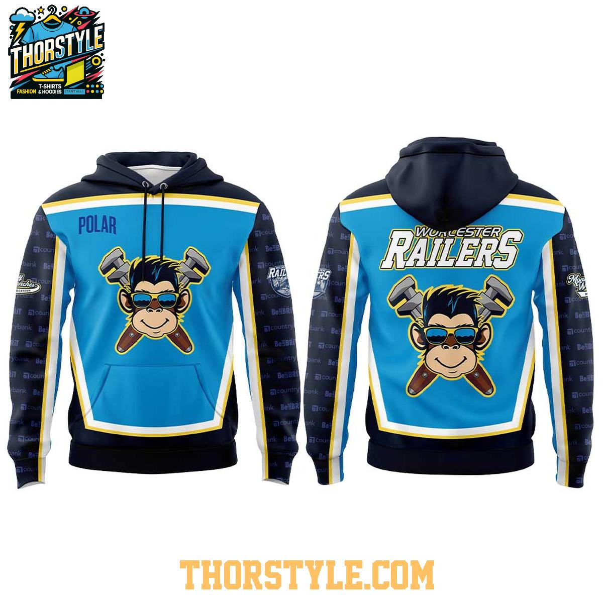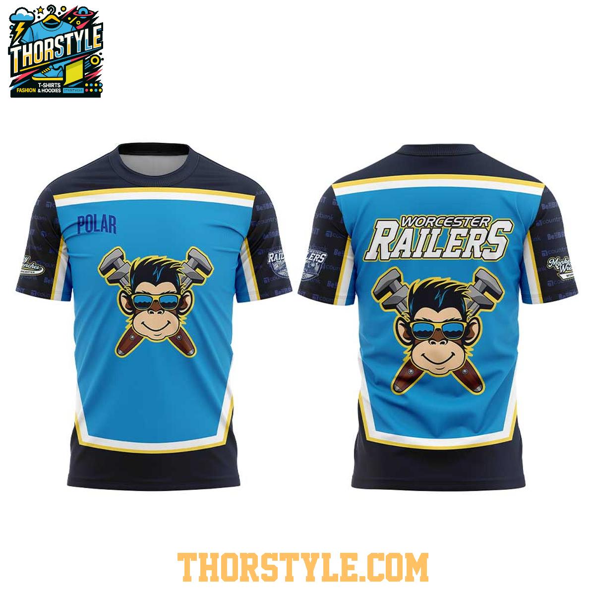 The design features the iconic Monkey Wrenches logo prominently displayed on both the front and back. This distinctive emblem is a symbol of the team's spirit and determination. The vibrant colors and detailed graphics ensure that the design stands out, making a bold statement wherever you go. The "Worcester Railers" lettering is also clearly displayed, leaving no doubt about your team allegiance.